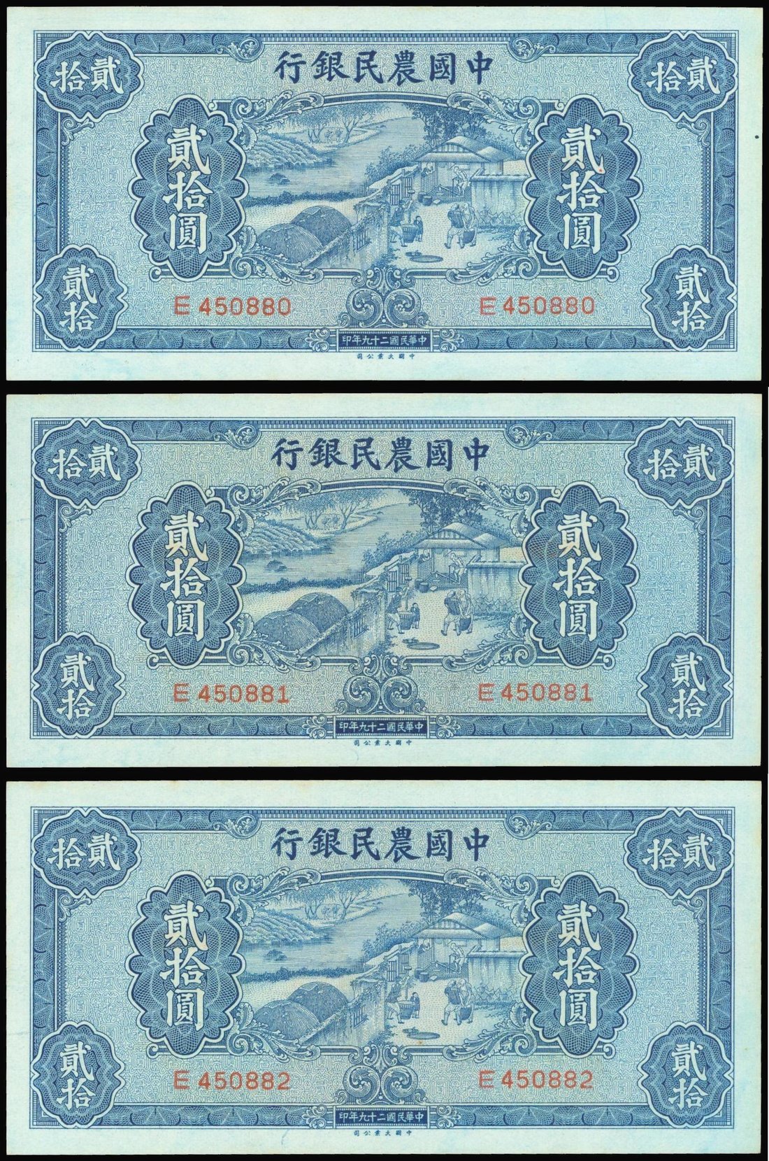 Farmers Bank of China, consecutive trio 20 Yuan, 1940, serial number E450880-2, blue, house and workers by river at centre, reverse blue on multicolour underprint,