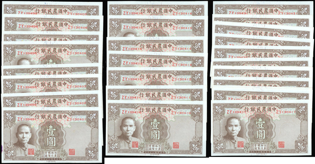 Farmers Bank of China, 1yuan, 1941, consecutive run of 31 notes, serial numbers ZY 130401 to 431, brown and multicolour, Sun Yat Sen at left, Chinese towers and sheep on reverse,