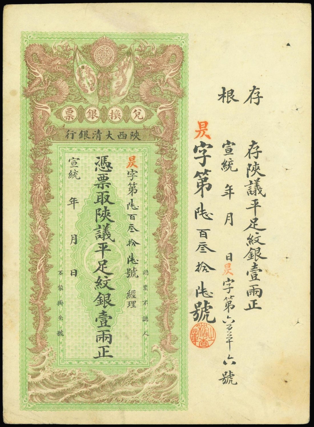 Ta Ching Government Bank, Shansi, 1tael, Xuantong era, (1908-1911), serial number 636, vertical format, green and brown with counterfoil, crossed flags and facing dragons, black Chinese text, plain white reverse,
