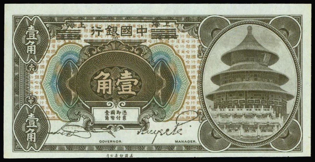 Bank of China, 1jiao, Shanghai overprinted on Harbin, 1918, serial number J532985, black and brown, Temple of Heaven at right,