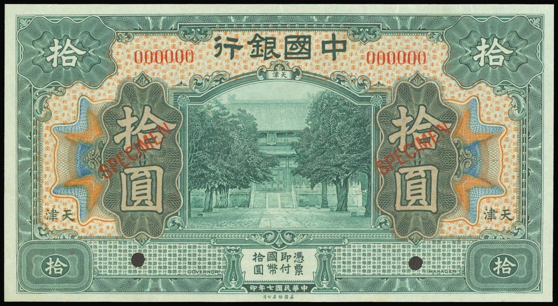 Bank of China, 10yuan, 'specimen', Tientsin, 1918, serial number 000000, green and multicolour, Chinese temple at centre, 'Ten' at each corner, hold punch cancelled, reverse green, plain vignettes,