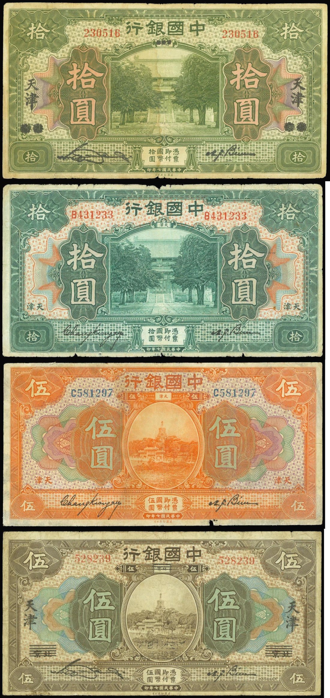 Bank of China, lot of 4 notes, 1918, 5yuan and 10yuan, Tientsin and 5yuan and 10yuan, Tientsin overprinted on Peking,