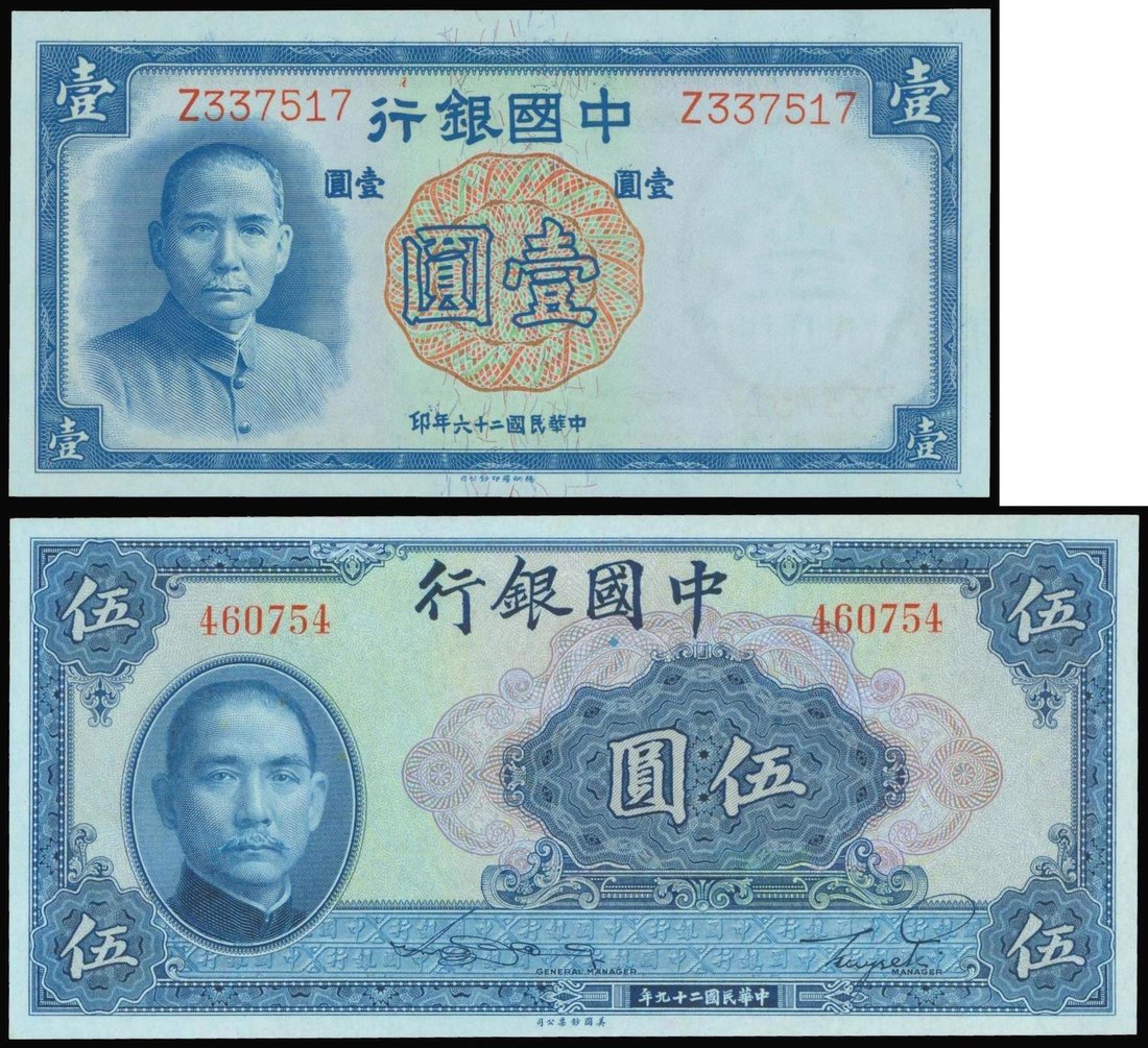 Bank of China, lot of 2 notes, 1yuan 1937 and 5yuan 1940,