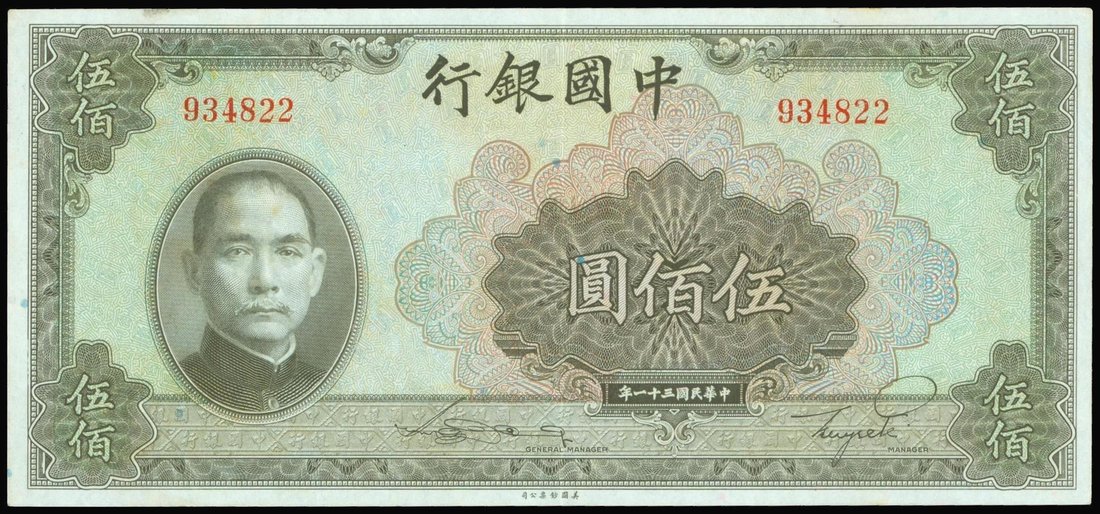Bank of China, 500yuan, 1942, serial number 934822, olive-green and multicolour, Sun Tay Sen at left, '500' at each corner, Temple of Heaven on reverse,