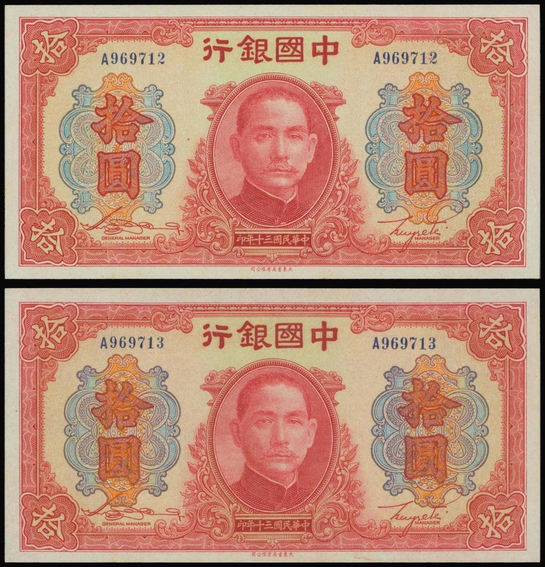 Bank of China, a consecutive pair of 10 Yuan, 1941, serial number A969712-3, red and multicolour, Sun Yat Sen at centre, reverse red, Temple of Heaven at centre,