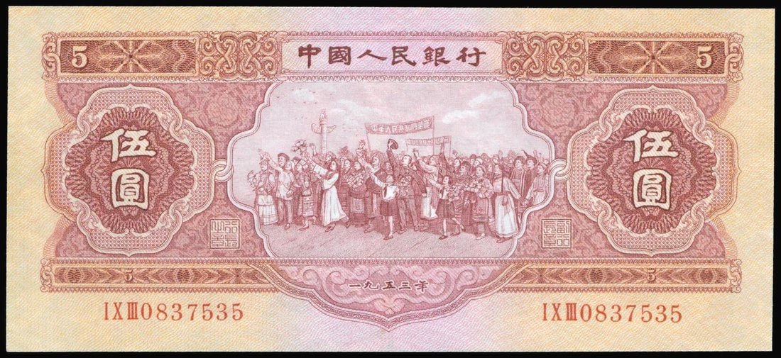 People’s Bank of China, 2nd series renminbi, 5 Yuan, 1953, serial number I X III 0837535, red-brown on lilac, demonstrators at centre, bank name in 5 different scripts on reverse,