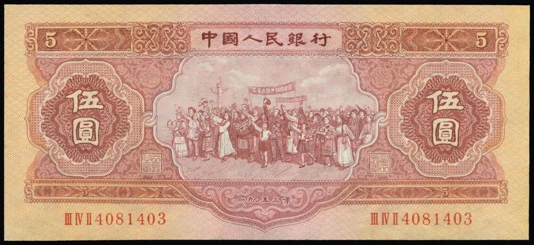 People’s Bank of China,2nd series renminbi, 5 Yuan, 1953, serial number III IV II 4081403,red-brown on lilac, demonstrators at centre, bank name in 5 different scripts on reverse,