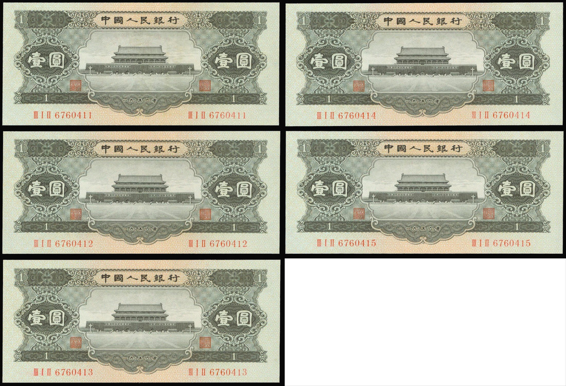 People’s Bank of China, 2nd series renminbi, 1 Yuan, 1956, consecutive run of 5, serial number III I II 6760411-5,black on light orange, Tiananmen at centre, reverse black,