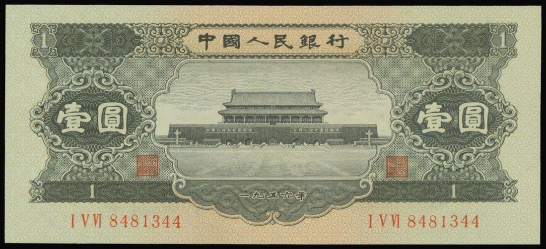 People's Bank of China, 2nd series renminbi, 1yuan, 1956, serial number I V VI 8481344, black and dark greem, Tiananmen at centre,