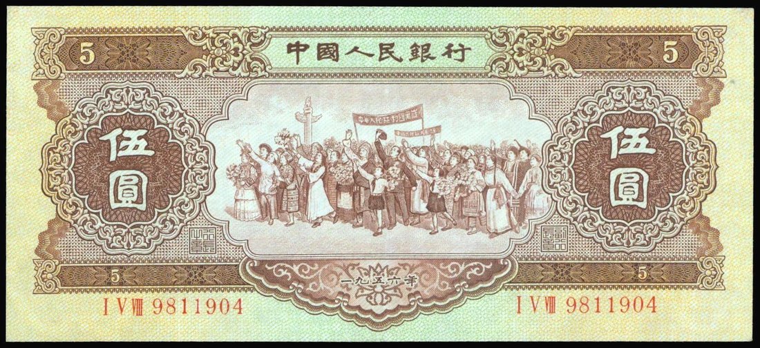 People’s Bank of China,2nd series renminbi, 5 Yuan, 1956, ‘Seagull’ watermark variety, serial number I V VIII 9811904, yellow, green and brown, demonstrators at centre, bank name in 5 different scripts on reverse,