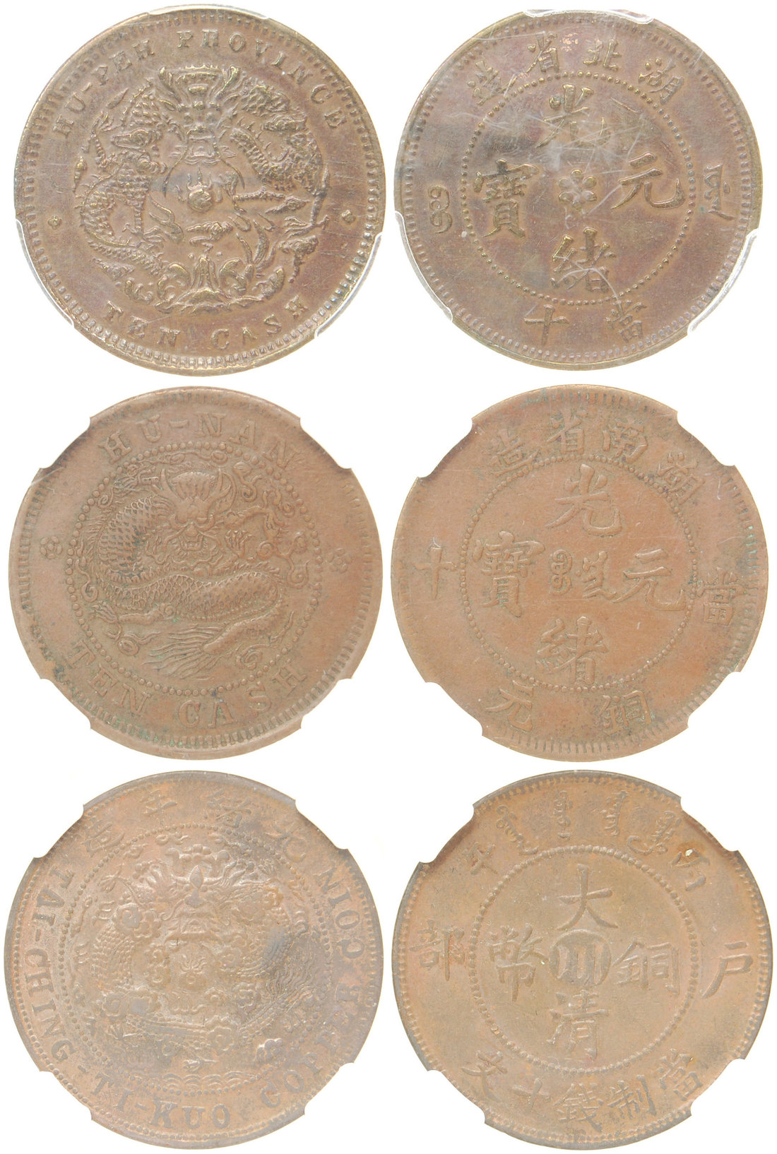 Qing Dynasty, lot of 3x 10coppers from Hunan, Hupeh and Szechuan, early 1900's, NGC AU53 BN, PCGS AU58 and NGC AU58 BN respectively (3).