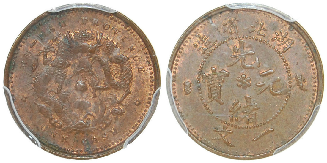 China, Qing Dynasty, Hupeh Province, (Y-121), 1 cash, ND(1906), dragon on obverse, Chinese characters on reverse,in PCGS holder MS62RB.