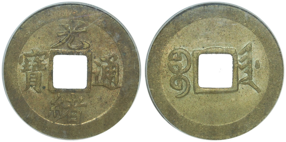 China, Qing Dynasty, Chihli Province, (C 8.1), brass 1 cash, Kuangxu era(1875-1908), Peiyang Arsenal Mint, Chinese characters ‘Guangxu Yuan Bao’ on obverse, Manchurian characters ‘Bao Jiyen’ on reverse,in PCGS holder MS 62.