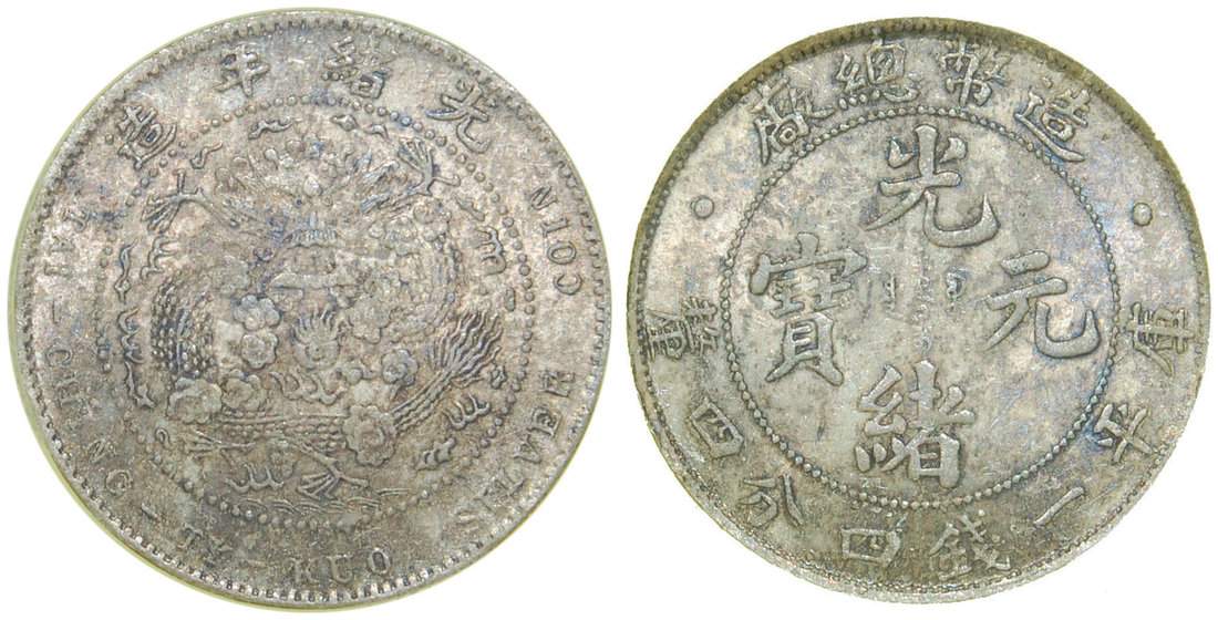 China, Qing dynasty,, (Y 13), silver 20 cents, Central Mint, Guangxu era(1908), dragon on obverse,in ICG holder MS 62, rare.