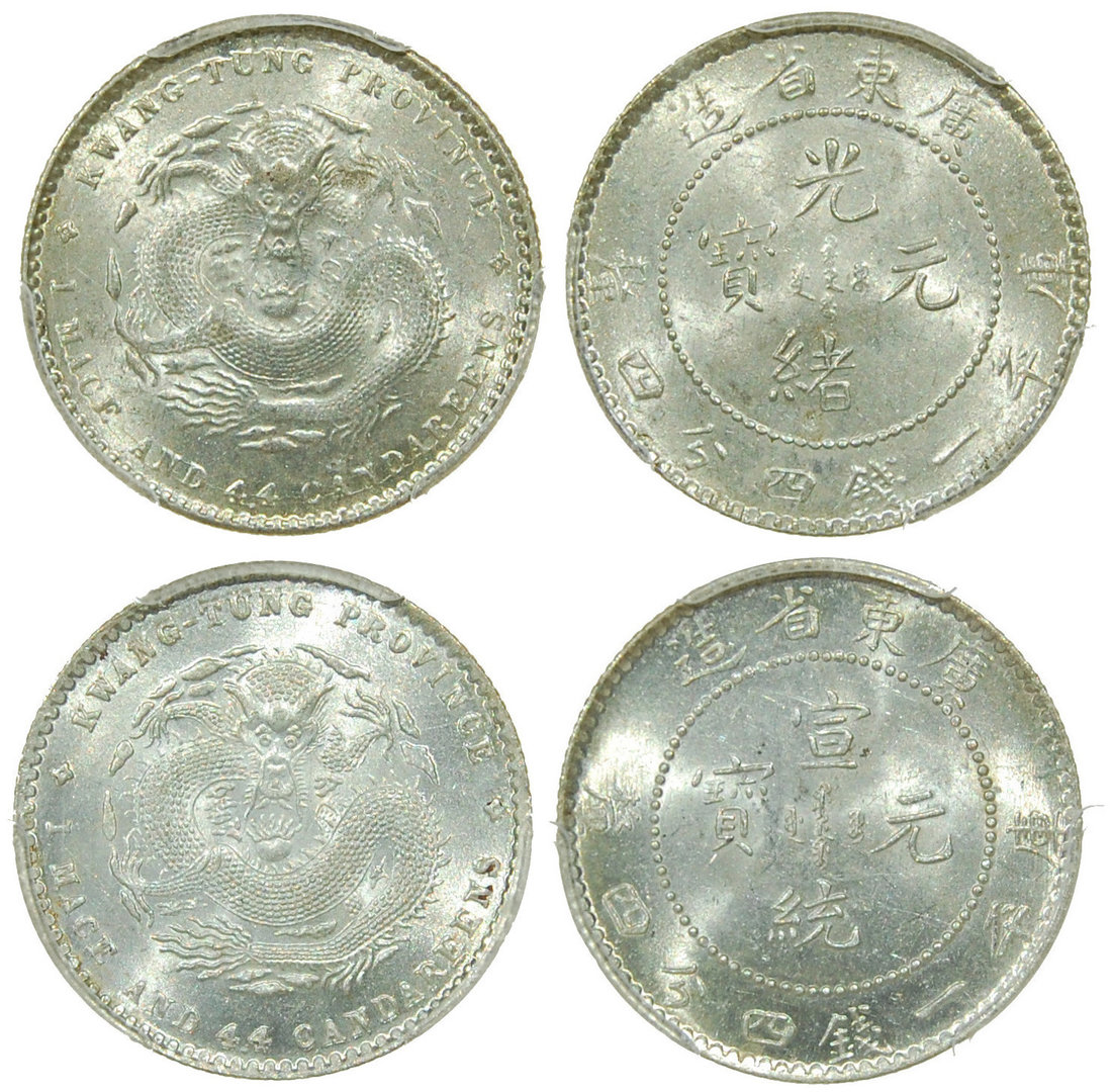 China, Kwangtung Province, a pair of Silver 20 cents, Guangxu and Xuantong era, dragon on obverse, Manchurian characters at centre on reverse,both in PCGS holder MS63.(2)