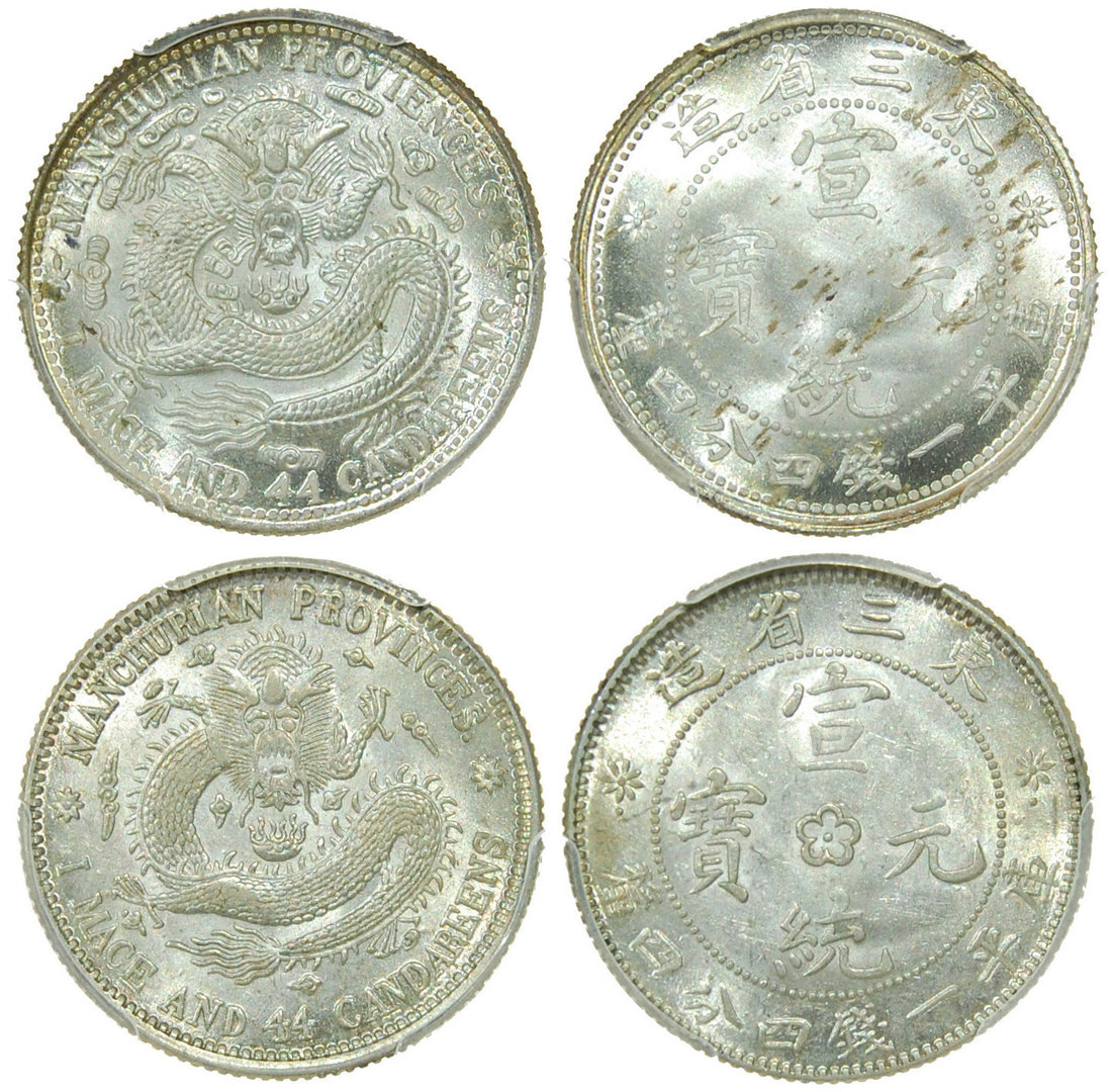 China, Manchurian Province,a pair of Silver 20 cents, Xuantong era,dragon on obverse, one with flower at centre on reverse,