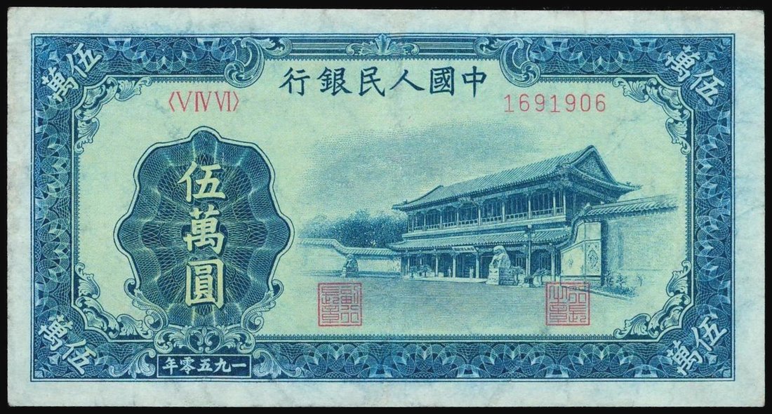 People's Bank of China, 1st series renminbi, 50000yuan, serial number V IV VI 1691906, 'Xin Hua Gate',