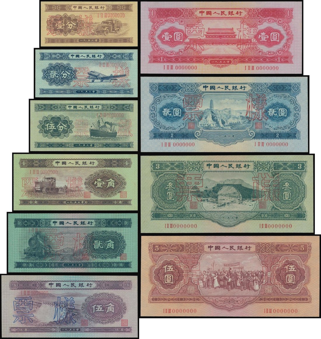 People's Bank of China, 2nd series renminbi, a short set of specimens containing 1, 2 and 5fen, 1, 2 and 5jia, 1, 2, 3 and 5yuan, all dated 1953 and with the same control number 25251, (Pick 860 to 869s), PMG 58, 64EPQ, 65EPQ, 66EPQ, 66EPQ, 64EPQ, 64, 66EPQ, 65EPQ and 66EPQ respectively, rare (10).