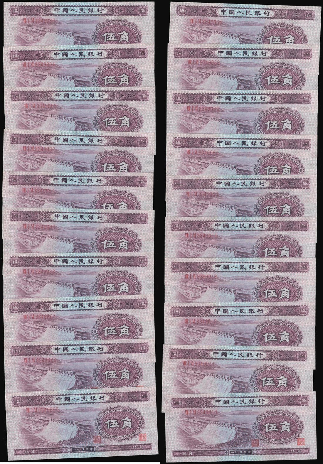 People's Bank of China, 2nd series renminbi, lot of 20x 5jiao, 1953, all from the same block of 100 notes,