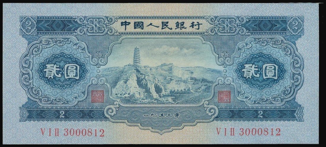 People's Bank of China, 2yuan, 1953, serial number V I II 3000812, blue, pagoda on hillside at centre,