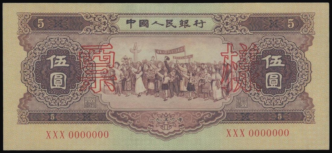 People's Bank of China, 5yuan, specimen, 1956, yellow and brown, demonstrators at centre,