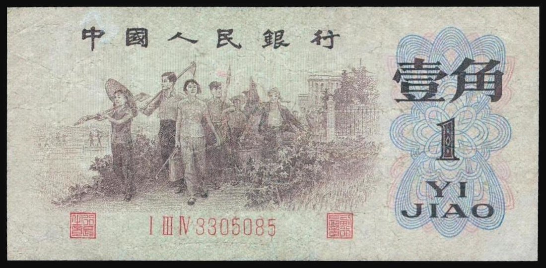 People's Bank of China, 3rd series renminbi, 1 jiao, 1962, serial number I III IV 3305085, the greenback star watermark variety,