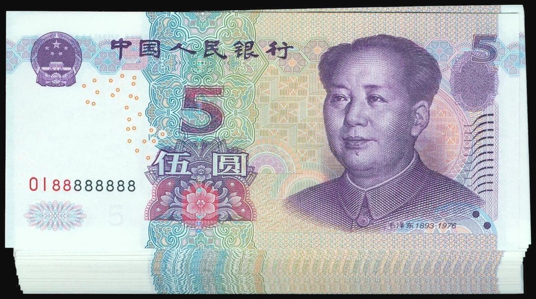 People's Bank of China, 5th series renminbi, a consecutive run of 100x 5yuan, 2005, serial number OI 88888801 to 88888900, containing the well sought after 88888888, (Pick 903), uncirculated (100).