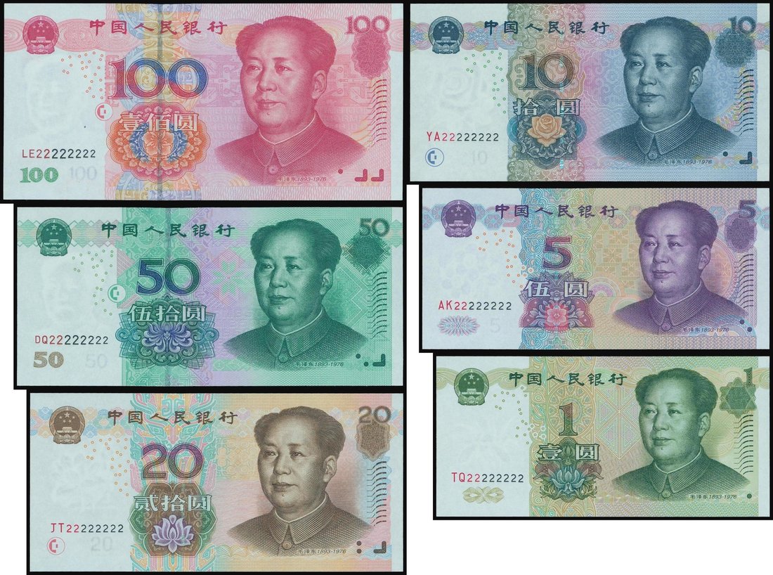 People's Bank of China, 5th series renminbi, 1, 5, 10, 20, 50 and 100yuan, (2005), lucky serial number '22222222' set, (Pick 895, 903, 904, 905, 906 and 907), all graded PMG 66EPQ Gem Uncirculated (6).