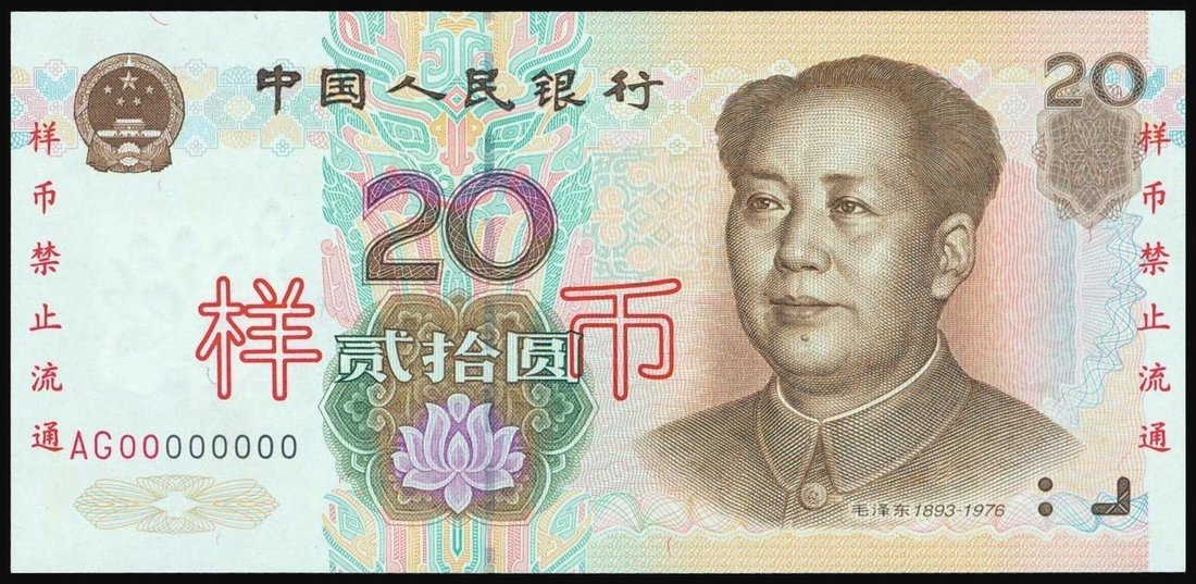 People's Bank of China, 5th series renminbi, 20yuan, specimen, 1999, brown and multicolour, Mao Zedong at right, control number 19641,