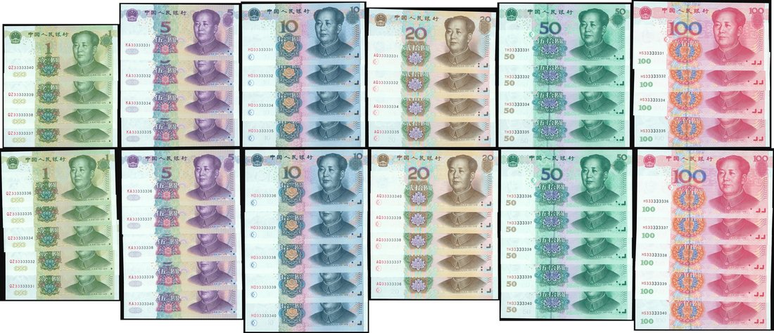 People's Bank of China, 5th series renminbi, $1 to $100, semi lucky serial numbers 9 of each denomination from serial number 33333331 to 33333340, WITHOUT the 33333333, (Pick 895, 903, 904, 905, 906 and 907), uncirculated (54 notes in total).
