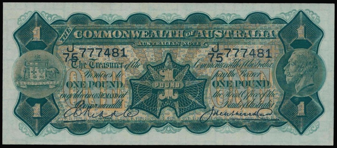 Australia,?1, ND(1927), serial number J75 777481,dark olive-green on multicolour colour, portrait Geogre V at right, arms at left, reverse green, Captain Cook’s landing at Botany Bay at centre,