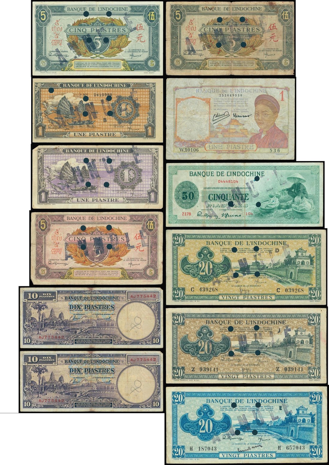 French Indo China, lot of 12 notes, mainly from the 1942 to 1951 series, containing 1piastre (4), 5piastres (3), 10piastres (1), 20piastres (3) and 50piastres (1), some officially hole punch cancelled with the ANNULE overprint,