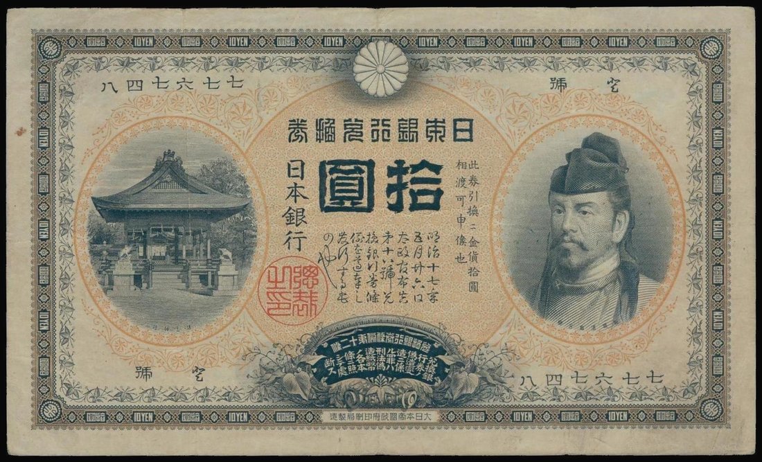 Japan,10 yen, 1899-1913, serial number 847677,black on light orange, portrait at right, building at left, reverse green, boar at centre,