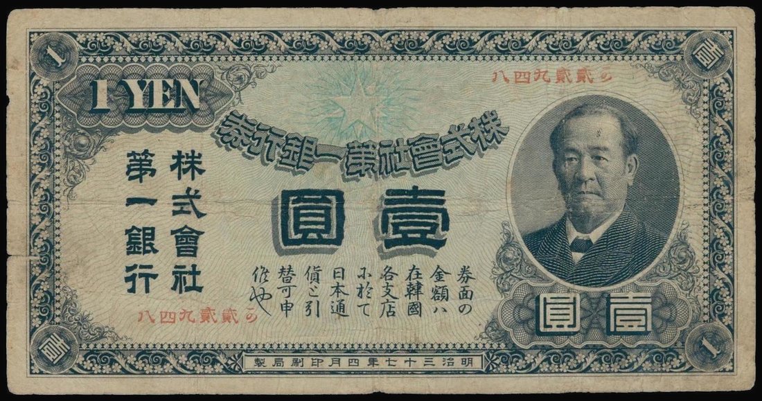 Korea,1 yen, 1904, serial number 84922,black on light blue underprint,portrait at right, reverse blue,