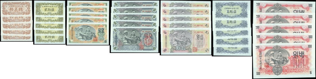 North Korea Central Bank,five sets of 15, 20, 50 chon, 1, 5 ,10, 100 won, 1947,multicoloured, similar design, chons with value on obverse and reverse, wons with farmer and worker on obverse,