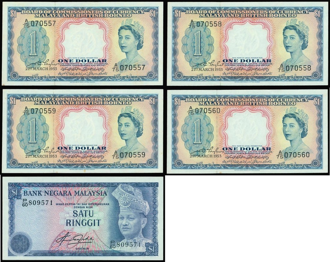 Mixed lot of Malay & British Borneo and Malaysia,consecutive run of four $1, 1953, serial number A/75 070557-60, 1 ringgit, ND(1981-83), serial number P/60 809571,blue on multicolour underprint, Elizabeth II and T.A. Rahman at right on obverse respectively,