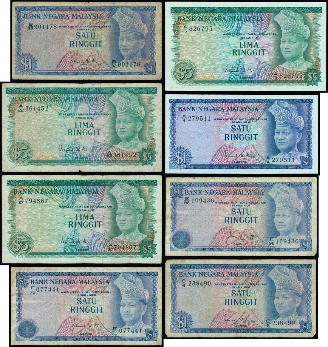 Malaysia, group of 8 issued notes, series one: 1 ringgit (3), 5 ringgit (3) and series three: 1 ringgit (2),