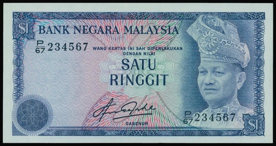 Malaysia,1 ringgit, ND(1981-83), ascending ladder serial number P/67 234567,blue on multicolour underprint, T.A. Rahman at right, reverse blue,