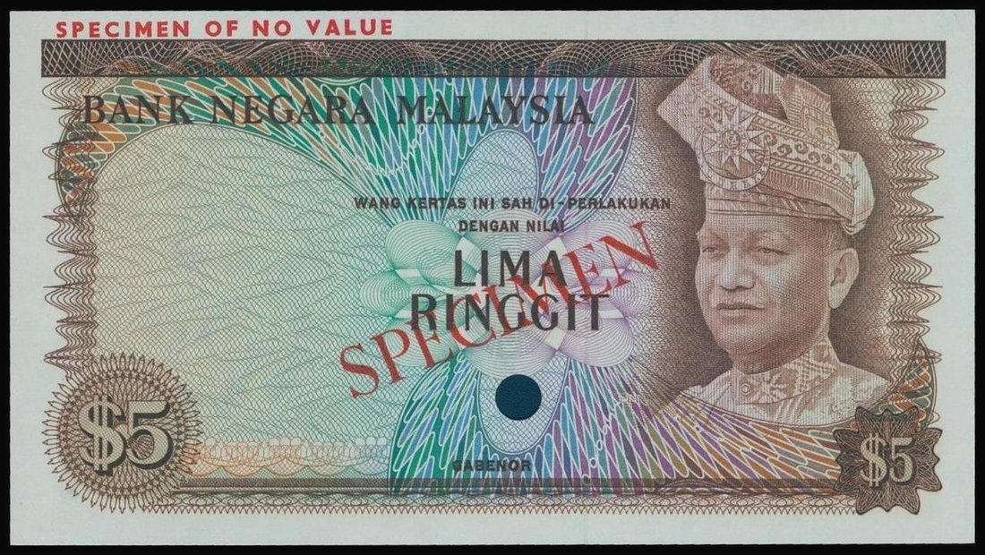 Malaysia,5 ringgit, ‘Colour Trial’, ND(1967-72),brown on multicolour underprint, T.A. Rahman at right, watermark of tiger at left,reverse brown,