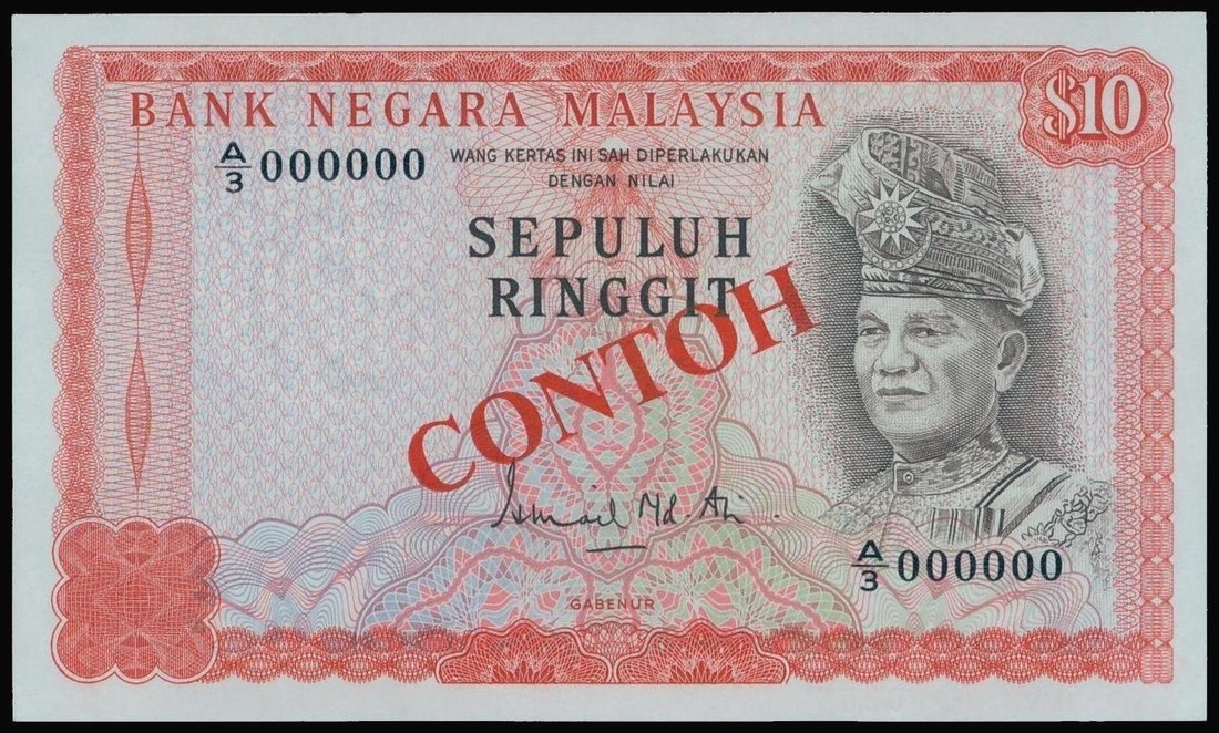 Malaysia,10 ringgit, ‘Specimen’, ND(1976-81), serial number A/3 000000,red-orange on multicolour underprint, T.A. Rahman at right, watermark of tiger at left,reverse red,