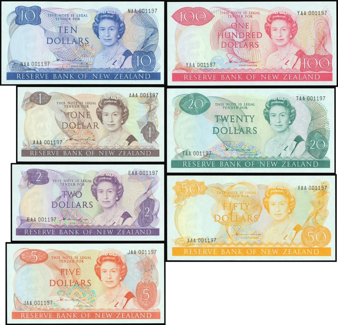 Reserve Bank of New Zealand, set of 7 values from $1 to $100, all signed by Hardie, 1981 to 1985, different prefixes but with the same serial number 001197,