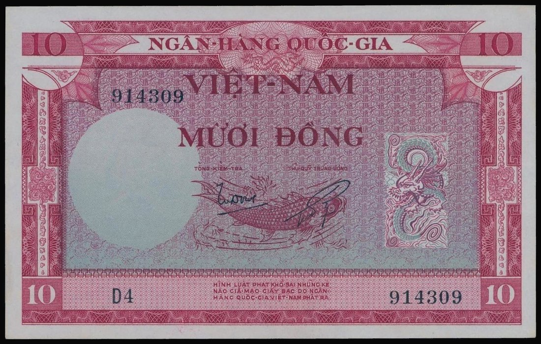 Viet Nam-South,10 dong, ND(1955), serial number D$ 914309,purple-red on pale blue underprint, fish at lower centre, reverse purple-red and yellow, boats and tree in field,