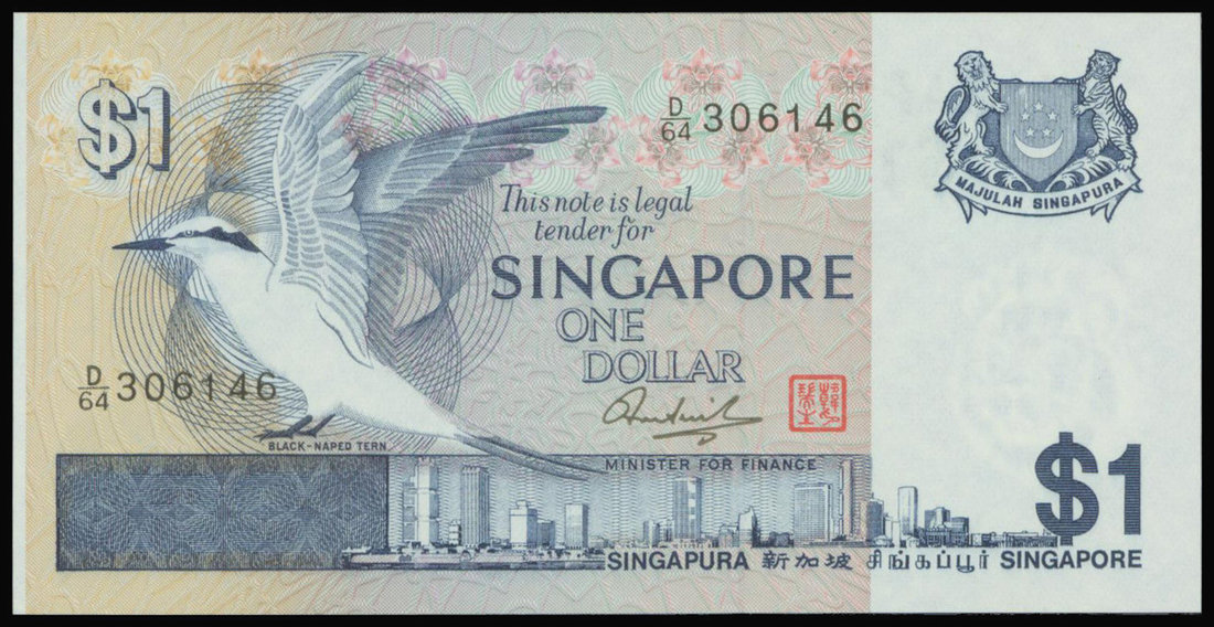 Singapore,$1, ND(1976), the ‘Bird’ series, serial number F/32 896917,errors, printing shifted to the right,