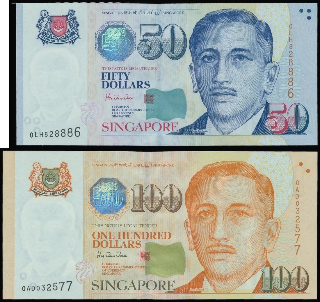 Singapore,$50 and $100, ND(1999), serial number 0LH828886 and 0AD032577,similar design, blue and orange on multicolour, Yusof bin Ishak at right, reverse arts and youth in field respectively,