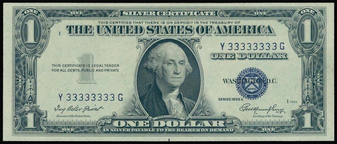 U.S.A.,$1, Silver Certificate, 1935E, rare 8 digits solid serial number Y33333333G,black, blue seal at right, Washington at centre, reverse green,