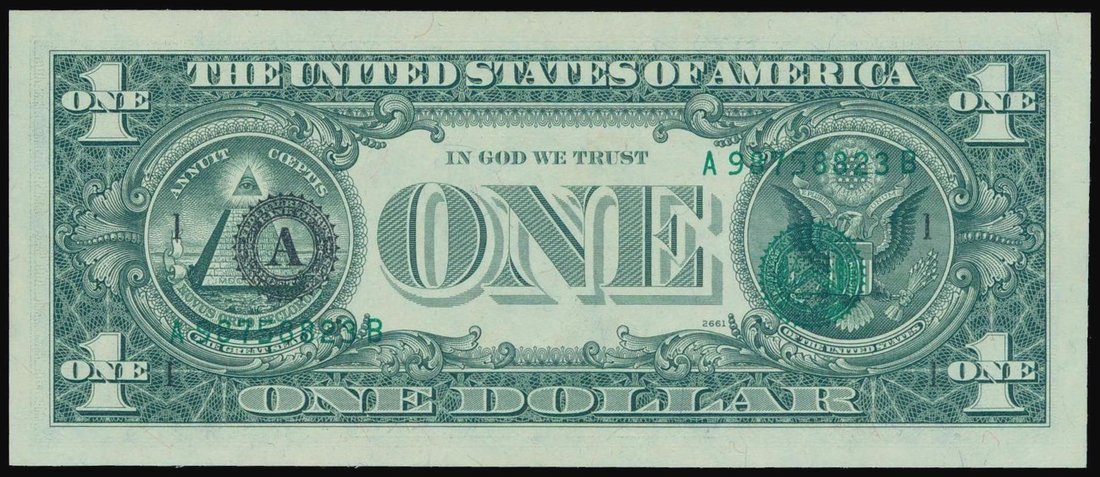 United Stated of America, $1, series of 1977A, error printing, the serial numbers and the green and black seals are printed on the reverse,