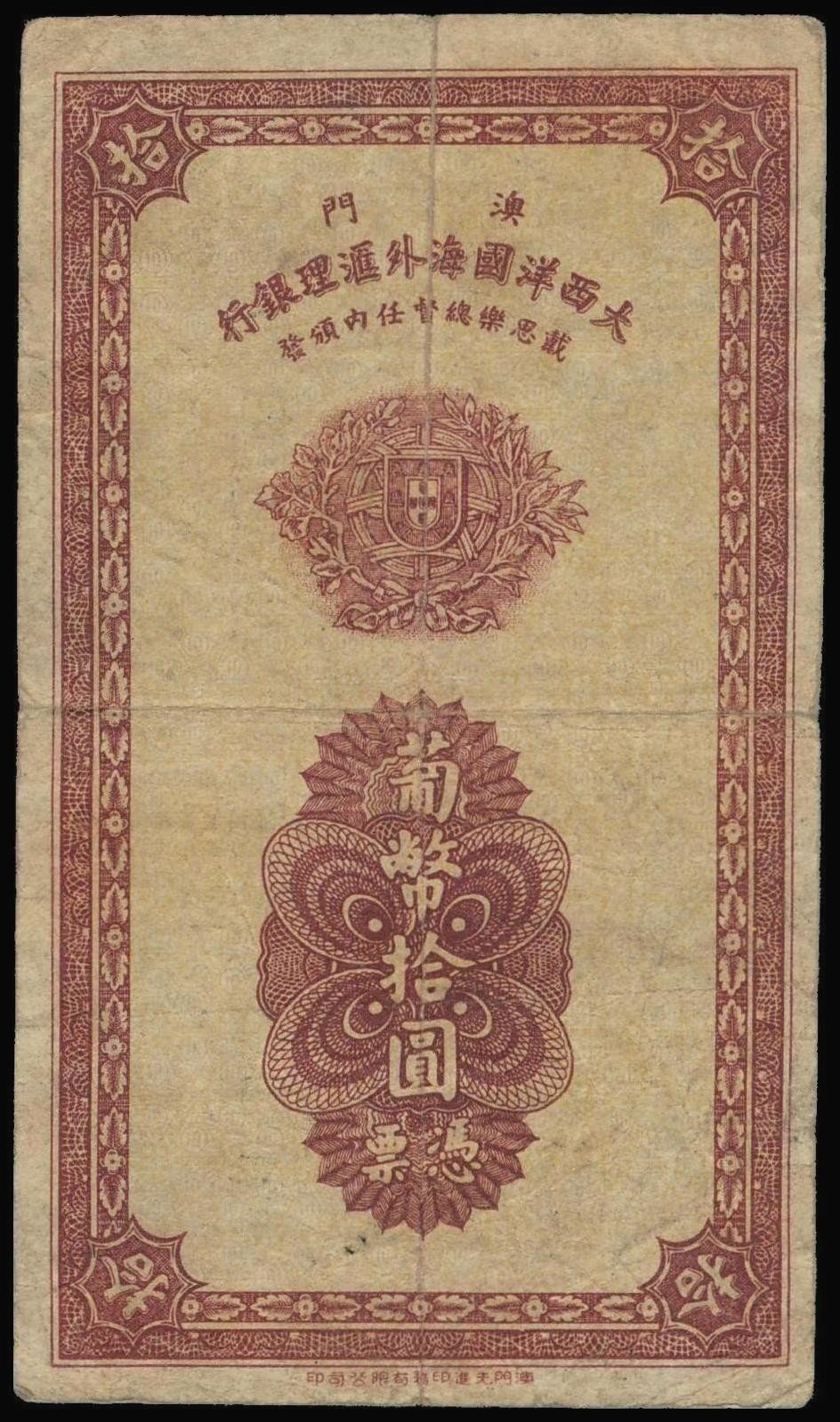 Macau, Banco Nacional Ultramarino, 10 patacas, 1944, serial number 07181, brown on yellow paper, black signatures,