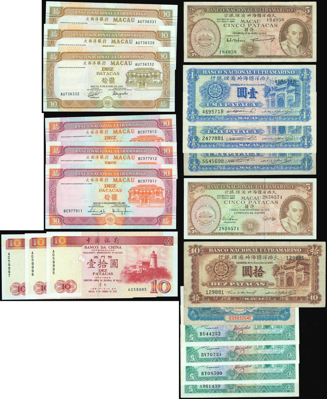 Macau, group of 20 notes, 1945 to 2001, including 1patacas, 1945 (3) and 10patacas, 1945 (1), and 10patacas, 2000 and 2001 (9),