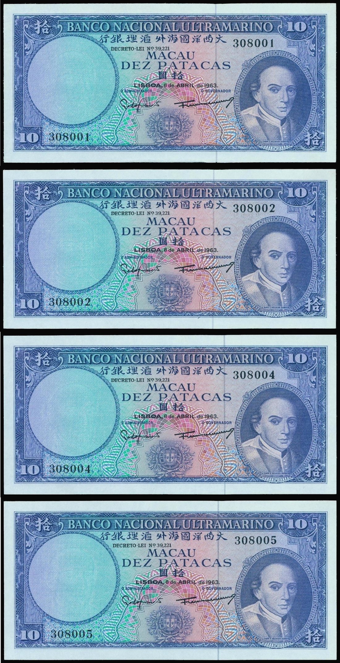 Banco Nacional Ultramarino, lot of 4x 10patacas, 1963, serial numbers 308001, 002, 004 and 005, blue, turquoise and pink, Carneiro at right, the reverse depicts a maiden watching departing ships,