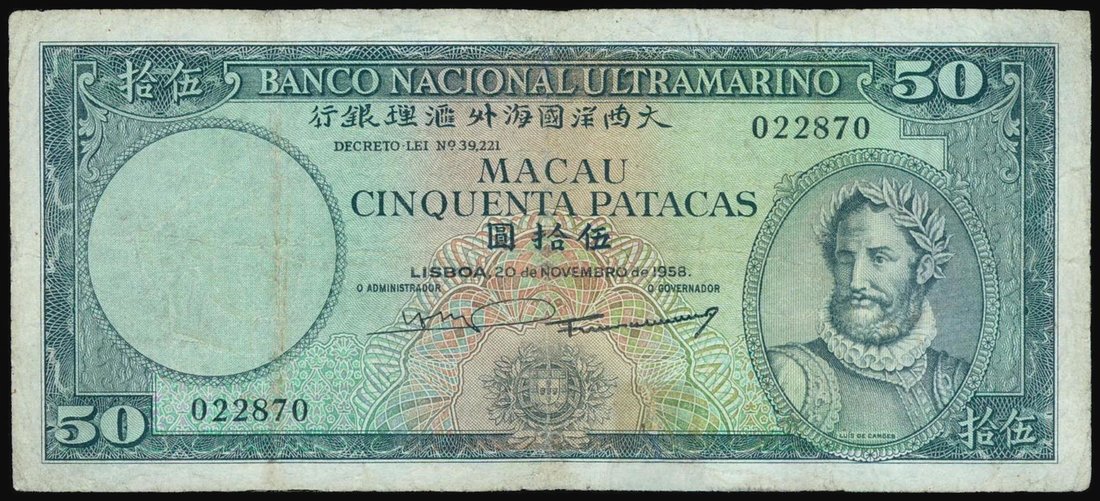 Banco Nacional Ultramarino,50 patacas, 1958, serial number 022870,green on multicolour underprint, Camoes at right, watermark at left, reverse green, maiden watching ships at centre,